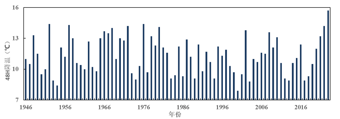 1946-2023年上海市区(徐家汇站)日最低气温48小时最大降幅 本文图片均为“上海天气发布”微信公众号 图