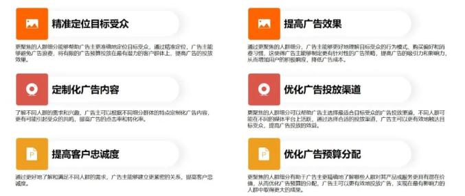 ● 更聚焦的人群细分可以帮助广告主更精准地投放广告,提高广告效果,减少广告成本,从而实现降本增效的目标。通过深入了解受众特征,广告主能够更好地满足市场需求,提高广告投资回报率。