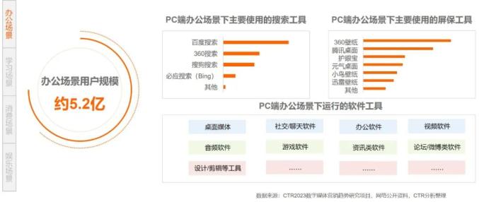 ● 本报告将办公场景定义为主要使用PC进行办公的人群,规模约为5.2亿,PC端办公场景下,搜索工具中百度搜索使用率为排名第一,360搜索使用率排名第二;屏保工具中360壁纸使用率排名第一,腾讯桌面使用率排名第二。
