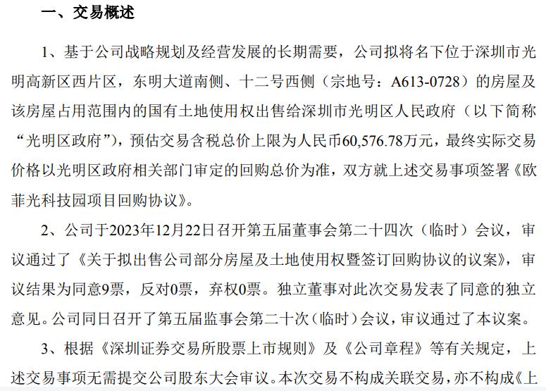 2023年12月26日,欧菲光公告,拟出售名下位于深圳市光明高新区西片区的房屋及相关土地使用权给光明区,预估交易总价上限为6.06亿元,并且双方还就上述交易事项签署了回购协议。该公告显示,本次出售房屋及土地使用权暨签订回购协议事项是为进一步优化资产结构,增加流动资金。