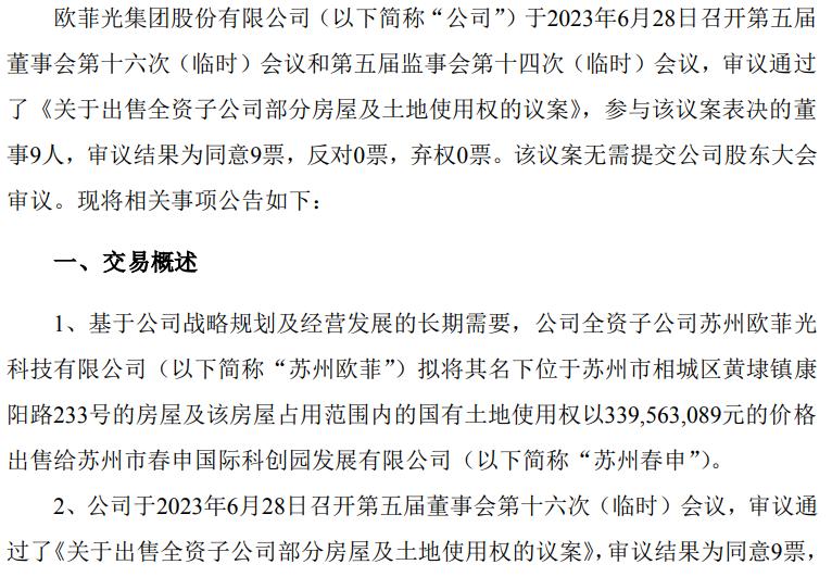 因为2023年6月29日的时候,欧菲光也曾发布过一份土地出售公告,基于公司战略规划及经营发展的长期需要,公司全资子公司苏州欧菲拟将其名下位于苏州市相城区黄埭镇康阳路233号的房屋及相关土地使用权以3.39亿元的价格卖给苏州春申,出售资产的目的还是,优化资产结构,增加流动资金。