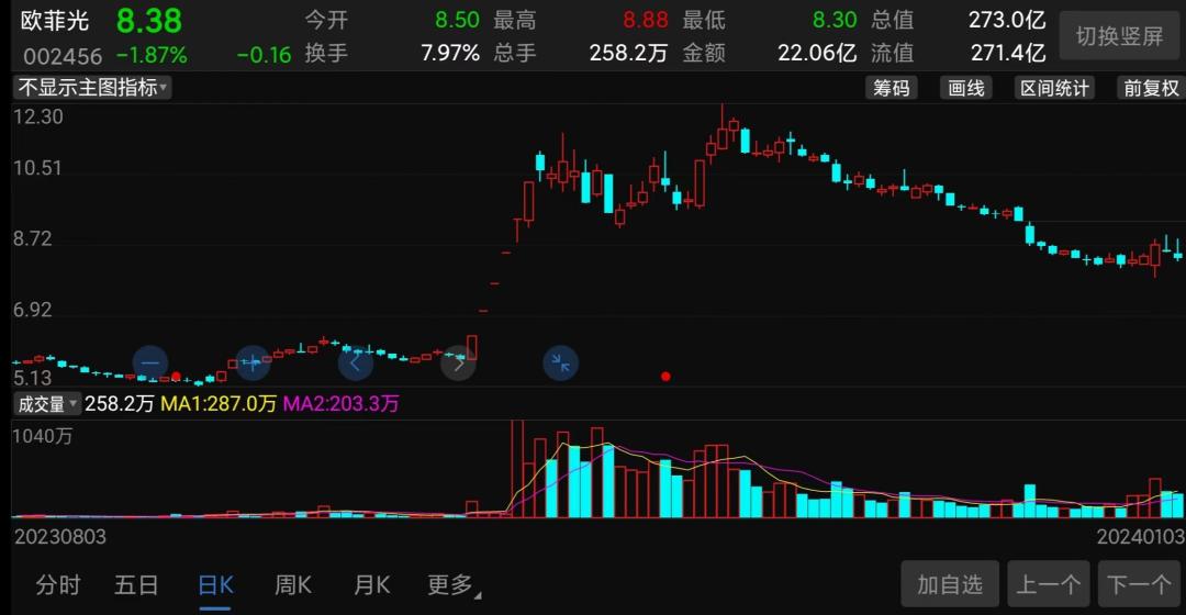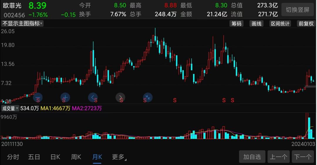 (欧菲光股价走势截图)可以看到,在2017年底的时候欧菲光股价还在26块左右,到2023年4月份已经跌至4-5元左右了,暴跌超82%,市值早已从当初700多亿的高位缩水至155亿左右,市值蒸发超500亿。