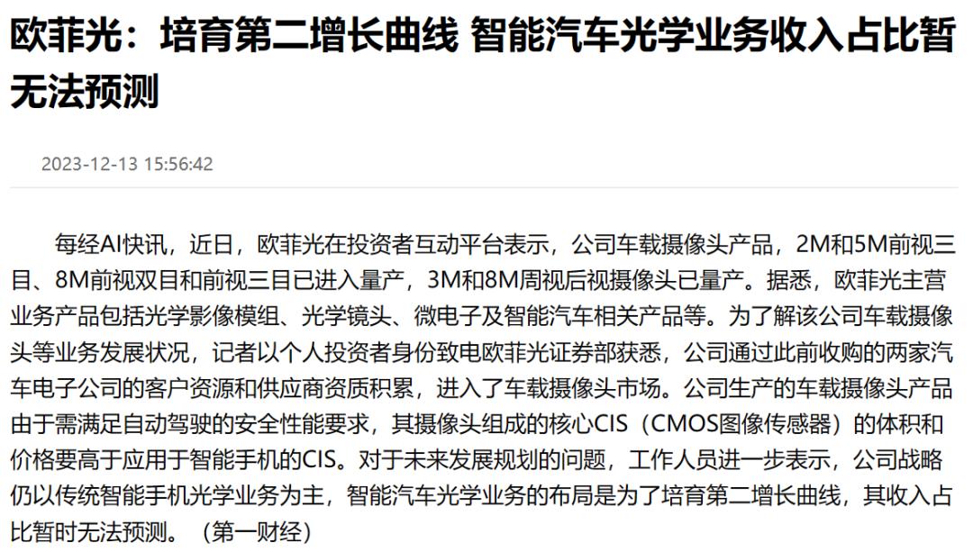 2023年12月13日,有媒体报道,欧菲光相关工作人员表示,公司战略仍以传统智能手机光学业务为主,智能汽车光学业务的布局是为了培育第二增长曲线,其收入占比暂无法预测。