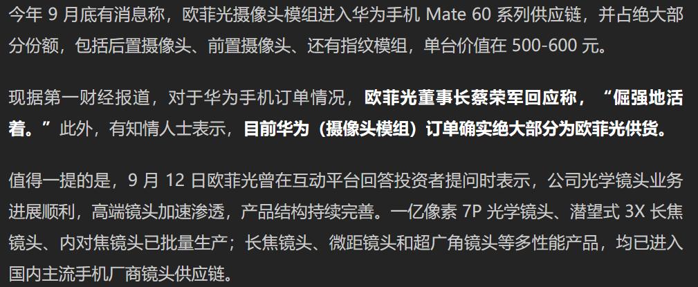 2023年10月12日,也就是欧菲光股价连板第五板的那天,有相关报道称,目前华为摄像头模组订单确实绝大部分为欧菲光供货。