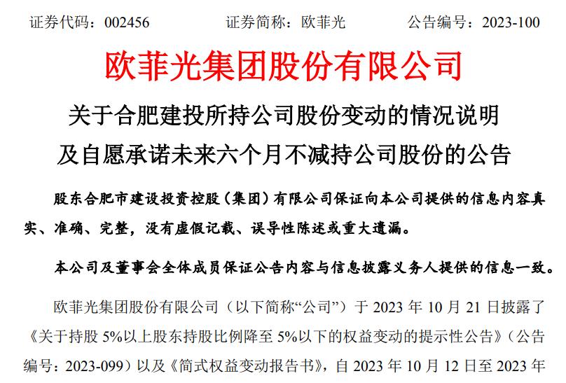(欧菲光公告截图)有意思的是,欧菲光在发布这份减持公告的同时,2023年10月21日也发布了一份股东合肥建投承诺未来6个月不减持的公告。