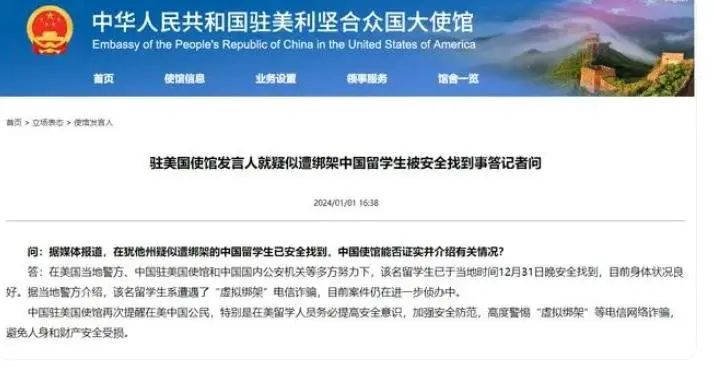 1月2日,中国驻美国大使馆发布消息称,在美国当地警方、中国驻美国使馆和中国国内公安机关等多方努力下,该名留学生已于当地时间12月31日晚安全找到,目前身体状况良好。据当地警方介绍,该名留学生系遭遇了“虚拟绑架”电信诈骗,目前案件仍在进一步侦办中。