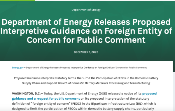 2024年1月1日,美国能源部(DOE)于去年12月发布《两党基础设施法》中“敏感外国实体(FEOC)”的解释文件、美国财政部(Treasury)和国税局(IRS)发布的《通货膨胀削减法》(IRA)第30D条清洁能源车辆税收抵免相关禁令的指导意见正式生效。