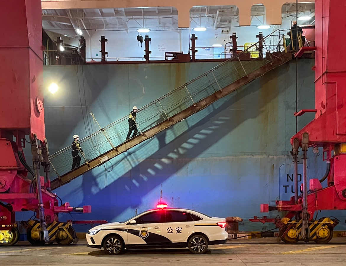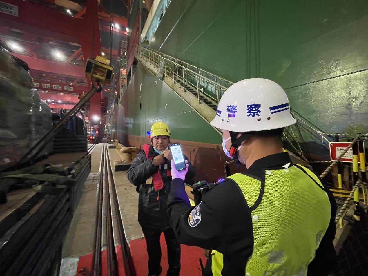 2024年1月1日凌晨3时,民警对新年首艘靠泊洋山深水港的船舶开展入境核查。上海边检 供图