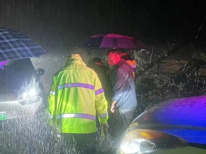 2023年8月5日23时28分许,香格里拉市公安局三坝交警中队接到两名外地游客报警求助称:“其驾驶车辆由香格里拉城区往白水台方向行驶,被困大雨中,请求出警救援”。接到报警后,三坝交警中队值班民辅警立即赶往事发地点,通过50多分钟的紧急救援工作。最终成功救助被困人员和车辆。