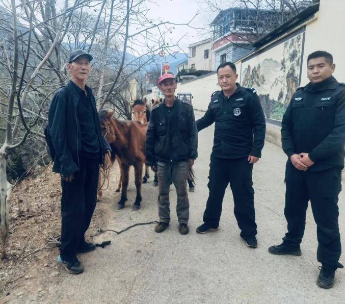 2023年2月16日9时许,香格里拉市公安局洛吉派出所接到辖区群众报警求助:“自家的四匹马丢失,找了三天寻找未果,请求民警帮助。”接到求助后,民警立即赶赴现场协助寻找。经过6个多小时的不懈努力,民警成功在习某某牧场周边5公里的林地里找到了走失的四匹马,失主看到失而复得的马匹连连感谢道:“这几匹马是我们家唯一的劳作力,真的太感谢警察同志了”。