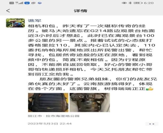 2023年5月5日,香格里拉市公安局建塘派出所收到一面印有“出警神速寻失物 执法为民显担当”的锦旗。 原来,在5月2日当天,一四川籍游客到香格里拉市纳帕海景区游玩时,不慎将一个黑色双肩包(包内有索尼牌的相机和镜头,价值3万余元)遗忘在景区观景台,在离开3小时后才发现背包遗失。在该游客已经离开遗忘地点100多公里时,抱着试试的心态拨打了香格里拉110求助。接到求助后,建塘派出所民警按照该游客提供的线索仔细查找后,最终成功将游客遗失的物品寻回并通过便车寄送到该游客手中。
