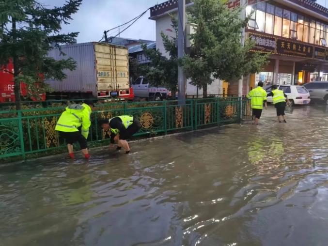 7月14日—15日,香格里拉迎暴雨天气,突如其来的大雨造成香格里拉城区多个路段出现积水,造成路面通行受阻,为确保人民群众出行安全,香格里拉市公安局直属城市交警大队闻汛而动,全力开展排查隐患、保障畅通工作。大队第一时间启动暑期交通保卫应急预案,将警力、车辆、装备投入到各主干道、积水、桥梁、低洼路段等重点部位,清理路障、疏导交通、清除交通隐患,在雨中演绎着“交警”到“浇警”的坚守与执着。