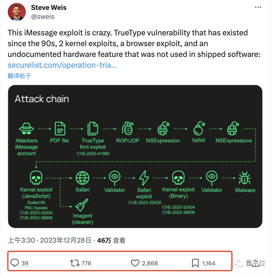 作者表示,Triangulation成功的关键其实是硬件漏洞CVE-2023-39606。