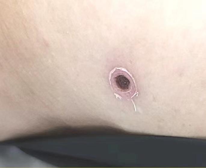 ◎ 医生发现的黑褐色圆形焦痂。/ 患者提供
