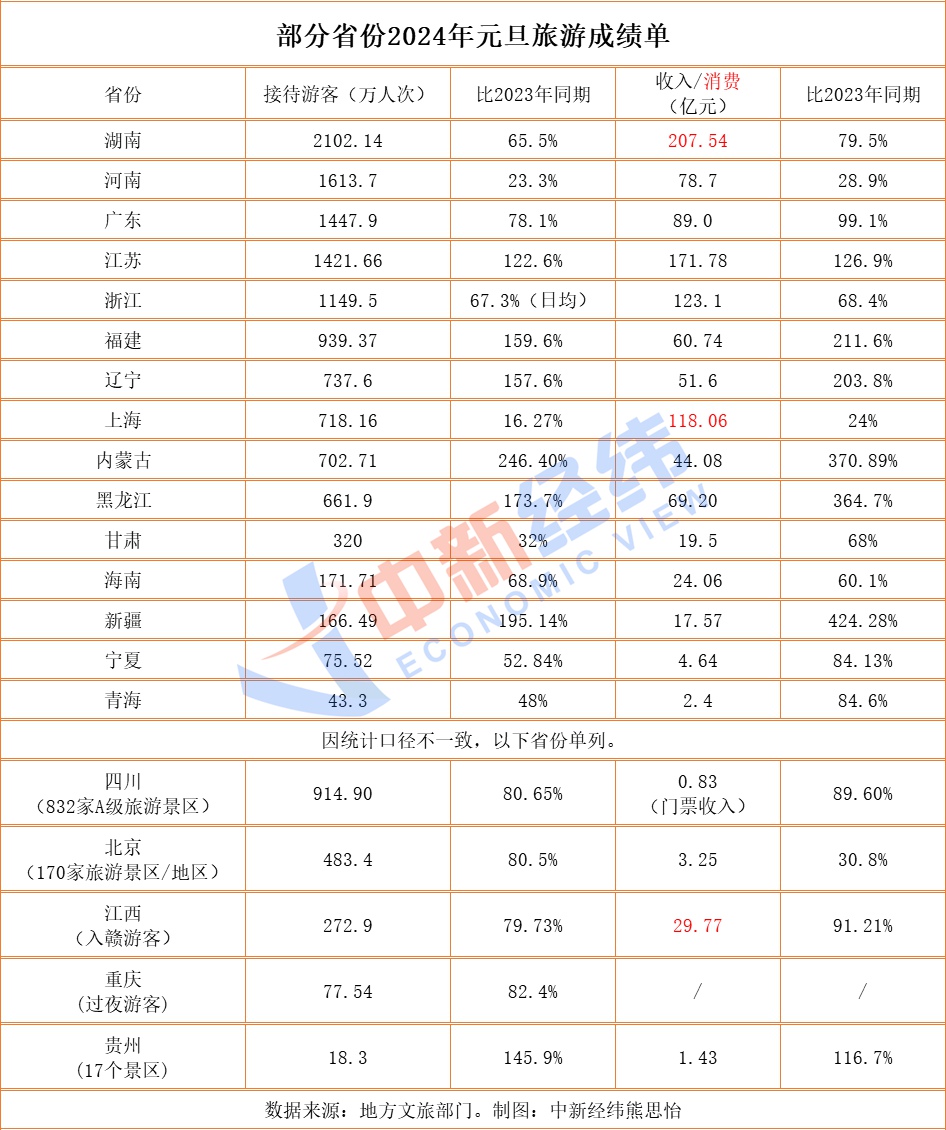 据中新经纬不完全统计,截至1月3日21时,全国已有20省份发布2024年元旦旅游数据。其中,湖南接待游客2102.14万人次,暂时领跑全国;河南接待游客1613.7万人次,位列第二;广东接待游客1447.9万,排名第三。此外,江苏、浙江两省游客接待量也超过千万。