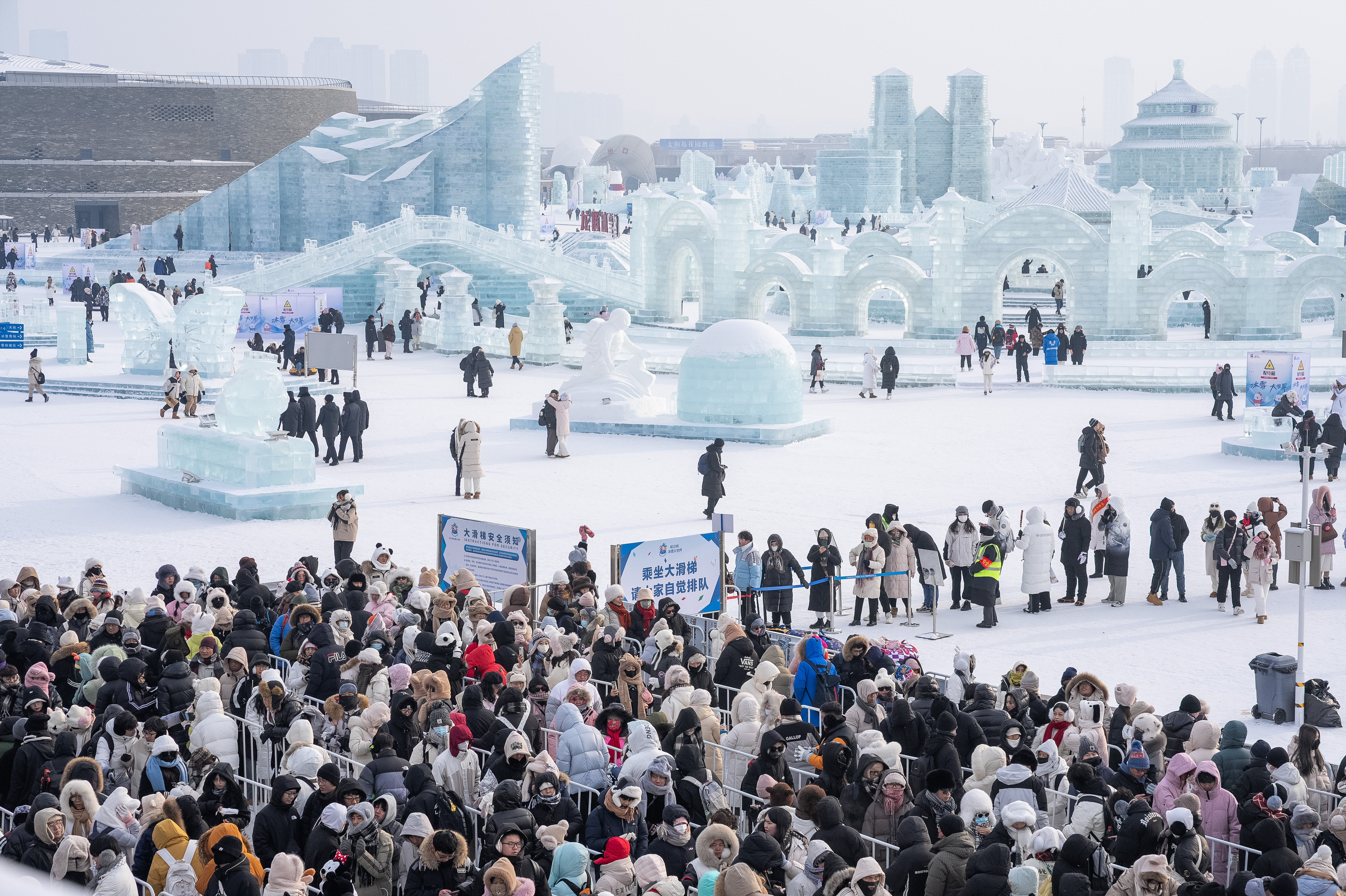 游客在哈尔滨冰雪大世界园区排队,等待体验超级冰滑梯(1月1日摄)。 新华社 图