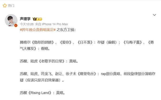1月2日,曾举报五月天假唱的音乐博主@声理学 发布了自己对湖南卫视跨年晚会真假唱鉴定。