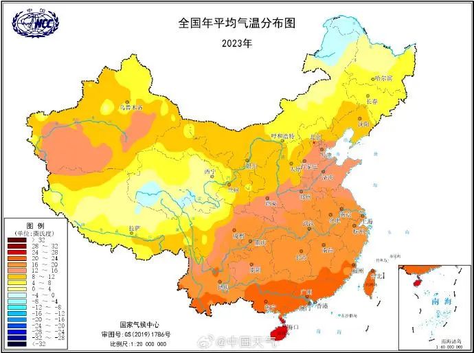 2023年中国平均气温创历史新高国家气候中心3日公布2023年中国天气情况。2023年,全国平均气温10.7℃,较常年偏高0.8℃,为1961年以来最高,打破2021年10.5℃纪录。全国共127个国家气象站日最高气温突破历史极值。