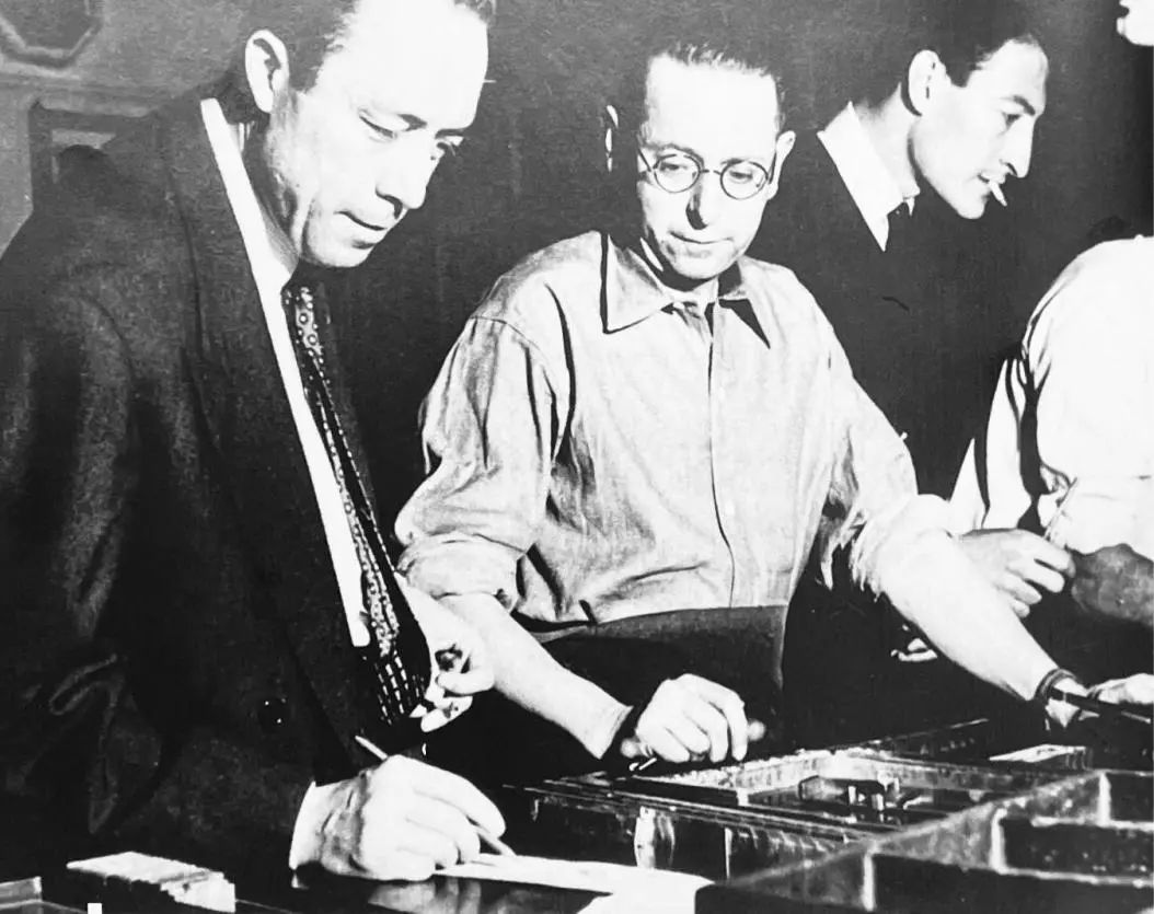 加缪与排字工人乔治·罗阿在《快报》的版台前排字工人勒麦特的追忆充满温情: