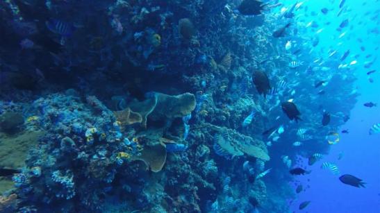 清澈的水中,阳光被折射成点点星光不断闪烁,色彩斑斓的鱼儿亲昵地依偎在光怪陆离的珊瑚旁,看着鲸鲨和大白鲨等庞然大物在不远处快速游走,还有神秘的洞穴、沉船静静地被无边包围。
