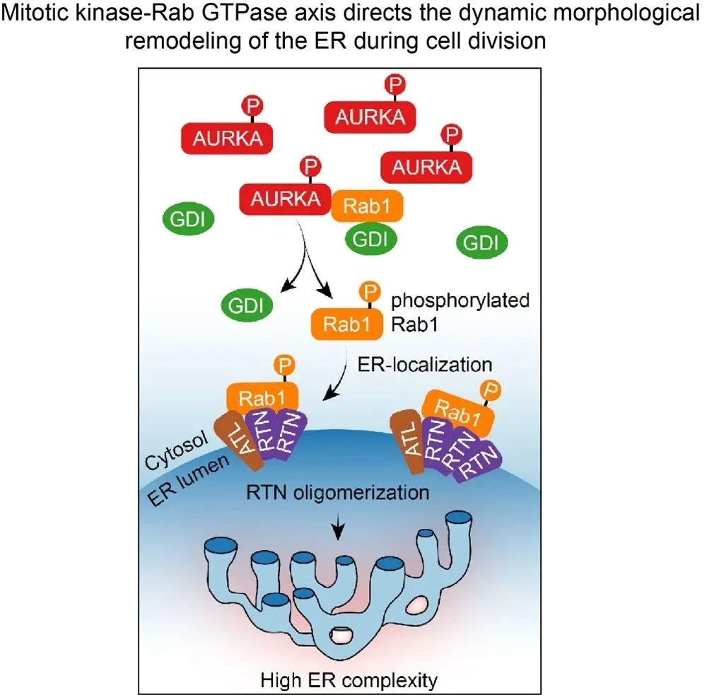 图2. AURKA-Rab1轴驱动有丝分裂内质网形态重塑示意图综上,这项研究不仅解释了内质网受细胞分裂信号调控发生形态重塑的具体过程,也揭示了Rab GTPase在有丝分裂过程中发挥的全新功能。