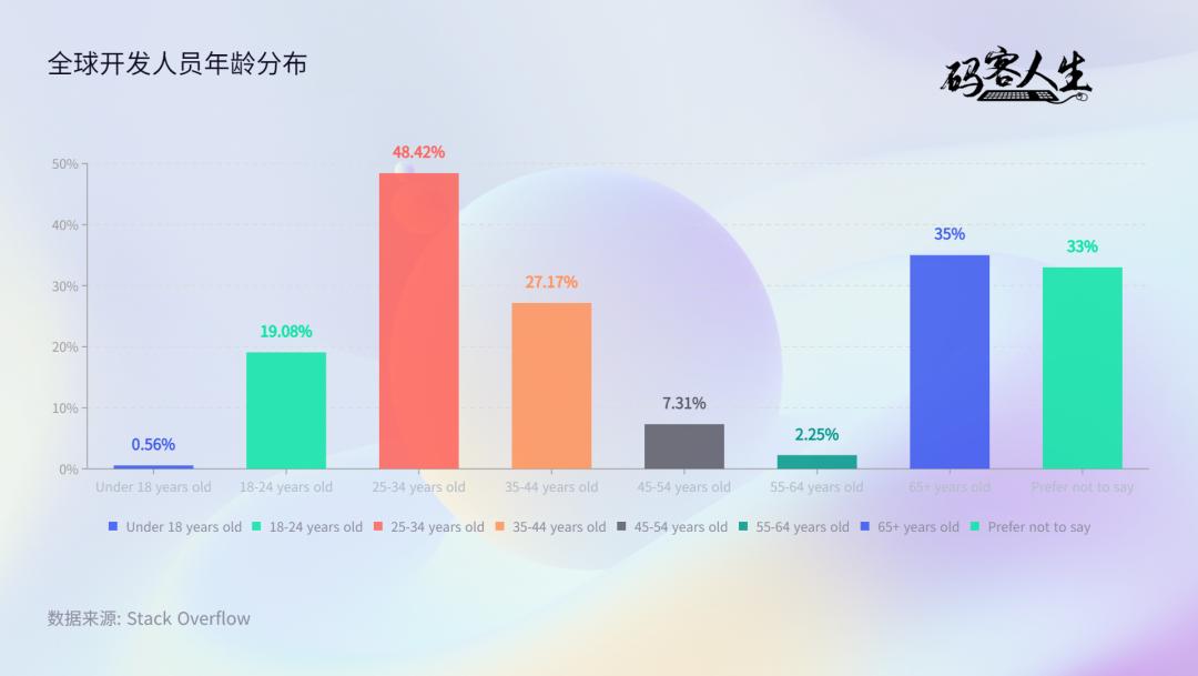 据Stack Overflow2023最新调研结果,全球开发人员48.42%来自25-34岁年龄组,是主力开发人员。而35至44岁的开发人员占21.71%,比国内比重高,职业周期更长。【在软件开发领域,男性占主导优势,但女性比例在上升】