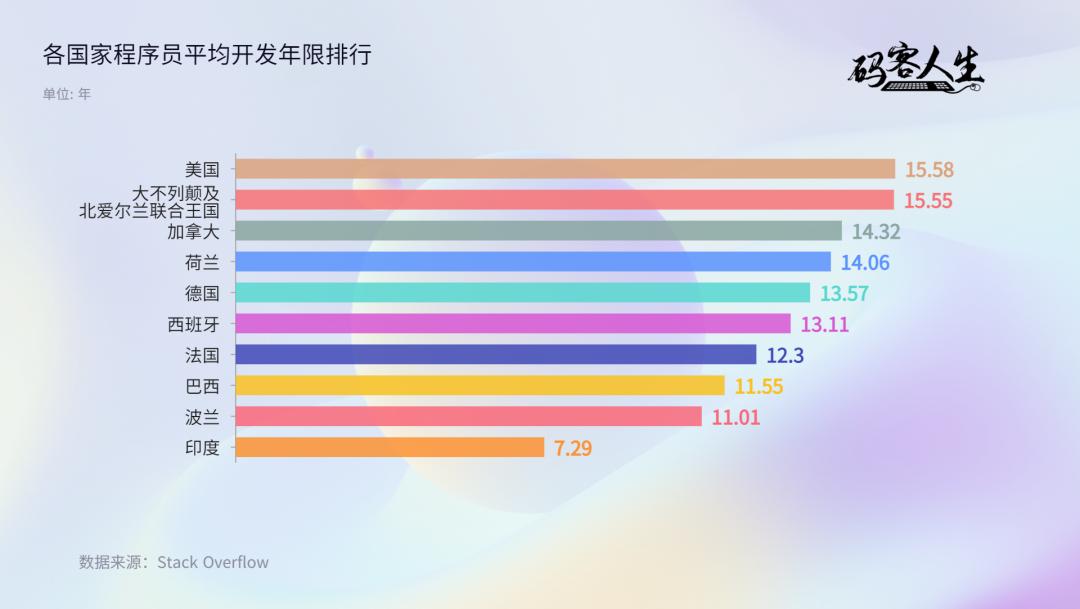 与国内相比,国外程序员的大龄焦虑较轻。根据Stack Overflow的调查显示,美国程序员的平均开发年龄最长,为15.58年,其次是英国,为15.55年,加拿大排名第三,为15.32岁。这是因为欧美科技发展具有先发优势,有成熟完整的产业生态,分工明确的产品目标,创新文化培养模式,在如此大环境下,欧美程序员数十年如一日专注于底层的研发,能真正推动技术的发展,越老越吃香。