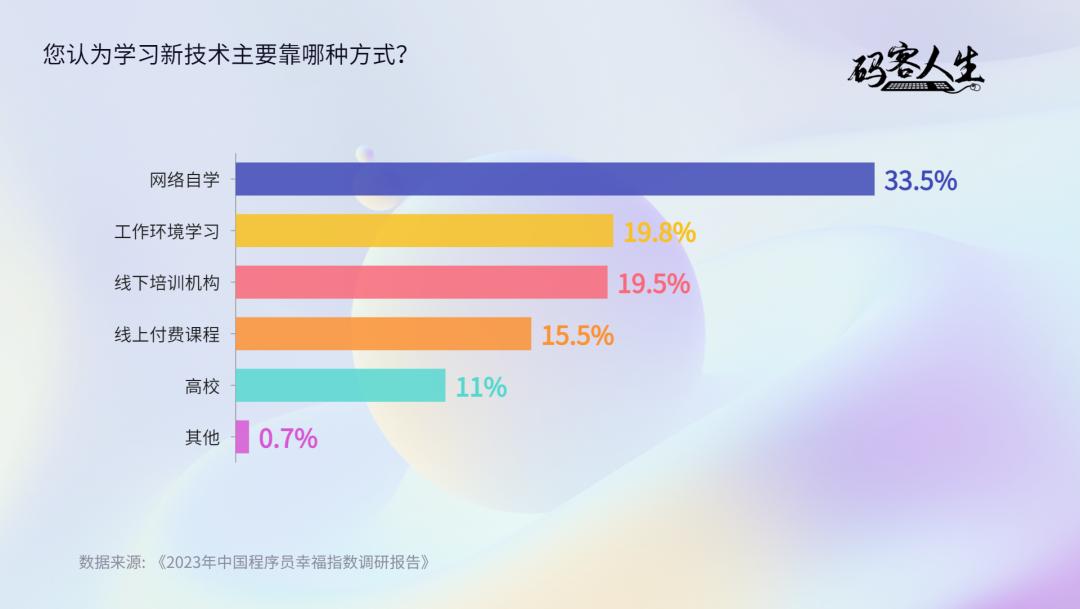 33.5%程序员靠网络自学学习新技术,19.8%的人通过工作环境学习,19.5%的人通过线下培训学习,15.5%的人通过线上付费课程学习,11%的通过去学校学习。在信息爆炸的时代,网上的技术资料不仅丰富且免费,还有各类视频辅助讲解,这大大减轻了程序员自学的困难。开发领域的技术更新速度快,这本身也要求从业者有较强的自学能力。大多数程序员倾向于自学成才,要求更高者会参考海外技术网站,学习论文,跟进一手技术信息,参加开源项目,在技术论坛积极参与讨论来提升自我。