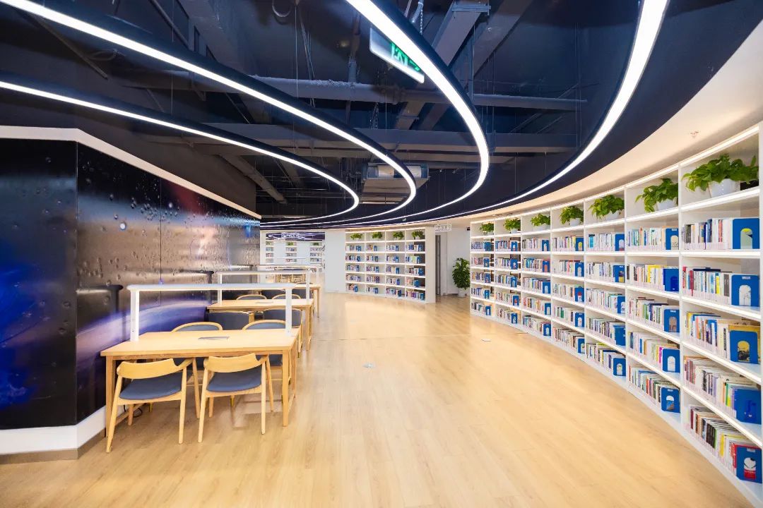 走进图书馆,馆内风格简洁明快,整体空间色调以灰蓝、黑白为主,搭配以木纹地板、木质桌椅,温馨舒适的色系打造出充满文艺的氛围。动静分离的空间设计,璀璨多元的星空元素……给读者带来了全新的借阅体验。