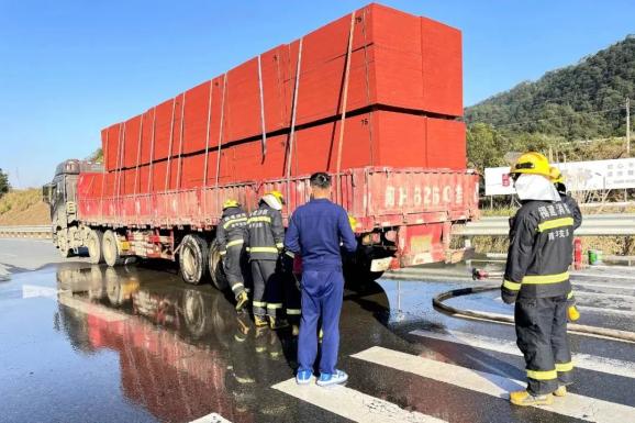 “嘭”的爆炸声伴随着腾起的黑烟,近日,一辆满载胶合板的大挂货车在南平市武夷山东山埔高架桥路口发生自燃,后轮胎已有明火趋势。驾驶员魏清华连忙下车,开起水箱用桶接水灭火,路过的小车司机也纷纷拿出自己的灭火器,有人跑去服务区寻求帮助。