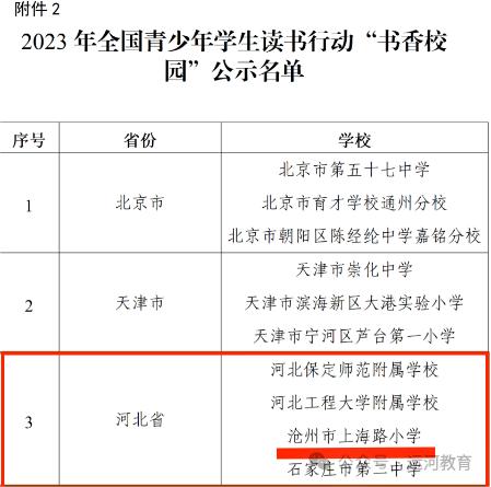 1月2日,教育部公示了2023年全国“书香校园”名单,沧州市上海路小学荣誉上榜!成为河北省入选的4所学校之一,也是沧州市唯一一所入选小学。荣登全国“书香校园”之榜是对我区多年来倡导阅读、弘扬书香文化的充分肯定,也是对我区进一步做好各项工作的鞭策和鼓励!