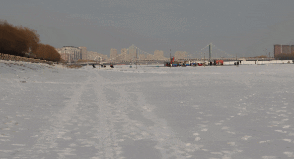当我和康康在大凌河边补空镜的时候,我看到了结冰的河面上已经有很多冰上乐园支起了摊位,也已经有很多人在里面开冰车、滑冰了。