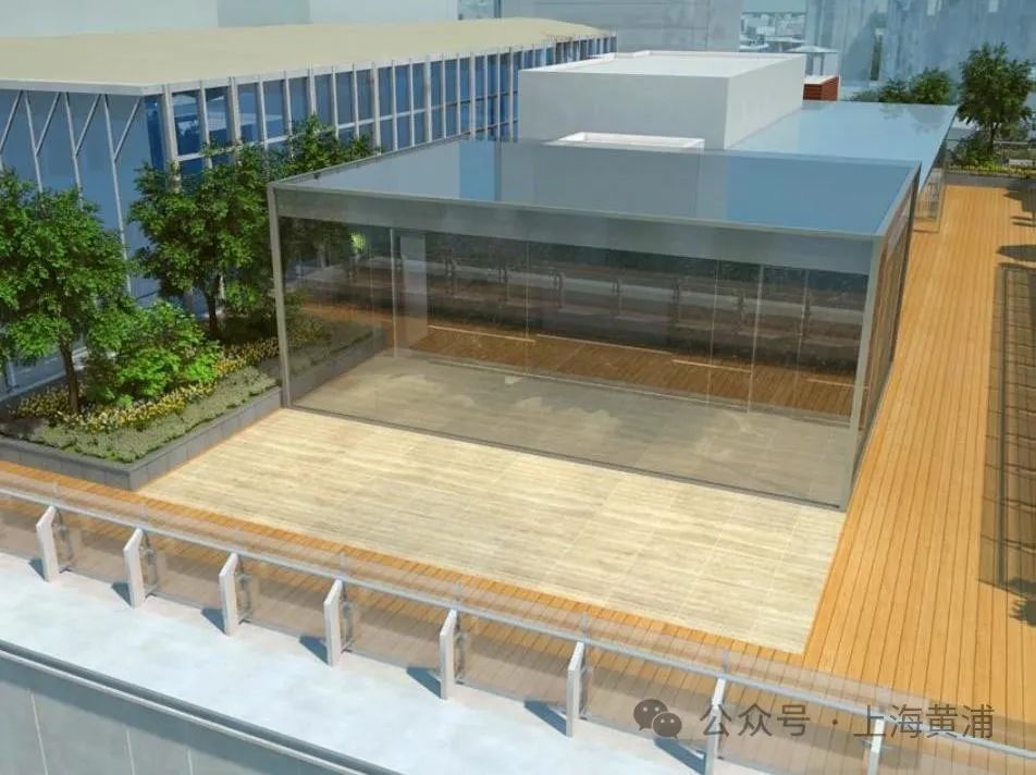 改造项目的另一座重点大楼是广场北侧商业体“C位”的原旅游纪念品商厦。这座大楼与世纪广场隔街正面相望,是俯瞰欣赏“珍珠贝母”的最佳观景位。基于这一得天独厚的区位优势,项目团队从形象提升、业态更新、店“场”互动三方面着手改造,将建筑四层开放为“剧场楼座”,结合餐饮外摆,打造“南京路上最美观景台”。大楼一楼中庭做了近10米的挑高设计,同时在原有的斜向顶棚表面加装了褶皱镜面不锈钢,实现对开放性空间特色的强化,既可以与“万花筒”相呼应,另一方面褶皱镜面反射出变形的周边环境,提升了空间趣味。另外,商厦顶楼全新打造出一个可以开合的玻璃“魔盒”——“魔盒”的外围采用通透的玻璃幕墙,各类设备管线收纳在吊顶中,可随屋面整体移动。天气晴好时,整个屋顶花园可作为餐饮外摆区;天气较差时,屋面向外滑动,从而扩展咖啡厅的室内区域为顶层人员活动提供了多种可能。