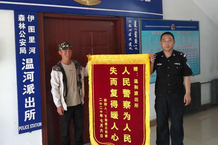 你好!警察节2020年7月10日,一位林场养殖户王长春焦急的来到伊图里河分局温河派出所称,其价值数万元的一大一小两马匹丢失了,为避免群众遭受巨大经济损失,我深入辖区进行走访,多方搜寻马匹线索,最终在辖区84公里道下寻得马匹。事后,失主带着“人民警察为人民,失而复得暖人心”锦旗再次来到派出所表示感谢。