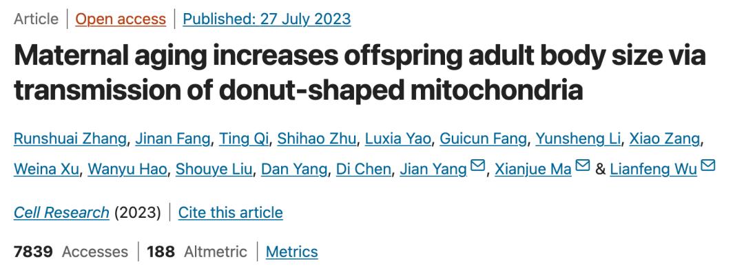 这项题为《Maternal aging increases offspring adult body size via transmission of donut-shaped mitochondria》的研究成果近期被发表在《nature》杂志cell子刊上。