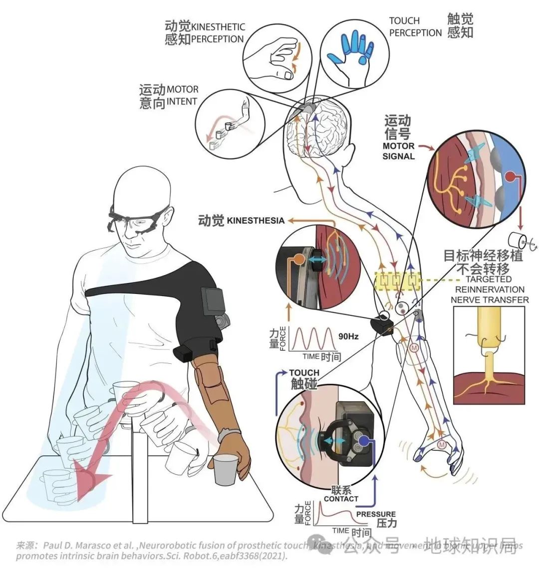 一种仿生上肢假肢的工作原理示意 整个假肢系统同时集成了触摸、动觉和运动意图此外,还有一些所谓的“半侵入式”脑机接口,在手术难度上小于侵入式,但信号质量自然还是不如侵入式。