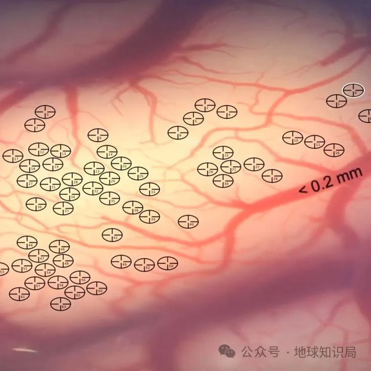金属针由 Neuralink 定制的飞秒激光磨机制造 不到一分钟的时间就能在针尖上塑造出几何形状。图片来源:Neuralink研究者事先划定好插入导线的区域,具体每根线的精确位置由R1自动判定,以避开微小的血管。