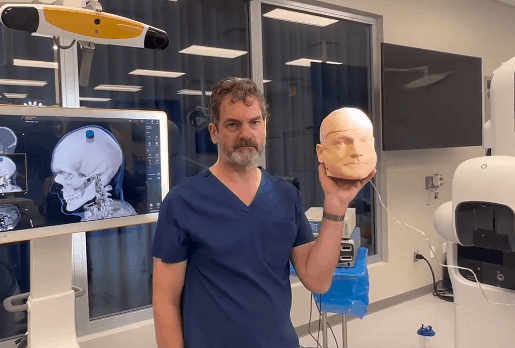 具体而言,需要将 MRI 和 CT 扫描对齐 在术中确定植入物在颅骨表面上的位置(图:Neuralink)位置确定后,切开头皮,用特制的开孔器,在颅骨上打开一个与芯片同样尺寸的圆孔,再剥离下面的硬脑膜,这时大脑皮层组织就露出来了。一台叫 R1 的手术机器人,会在光学系统的辅助下,将 N1 上的 64 根导线一一插入大脑皮层中。
