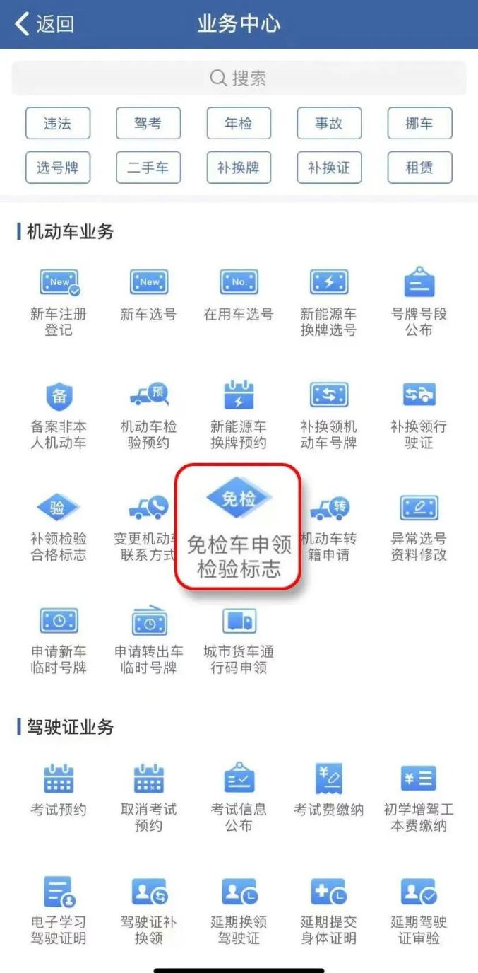 交通安全综合服务管理平台交通安全综合服务管理平台(ha.122.gov.cn) → 业务办理 → 机动车业务 → 免检车申领检验标志(填写材料在线办理)。