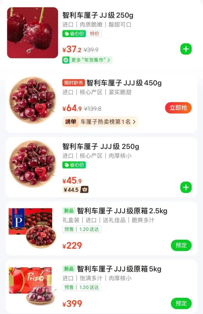 在上海,据新闻坊报道,超市内某品牌450克的智利车厘子(j)从59.9元下降到33.9元,另一品牌5斤装的智利车厘子(jj)从349元下降到248元。在武汉,据极目新闻报道,一座大型连锁超市工作人员表示,卖场里的智利车厘子去年11月底2个J大小每斤138元,现在变为了最低69.9元,正好“打了对折”。
