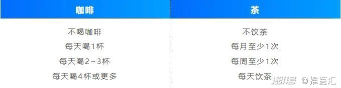每个人的身体情况和生活习惯不同,有人不喜欢喝茶或者咖啡,有人喝咖啡会出现尿频、心悸、肠胃不舒服等情况。如果没有饮茶或喝咖啡的习惯,不必强求,也可以通过其他健康生活方式带来获益。