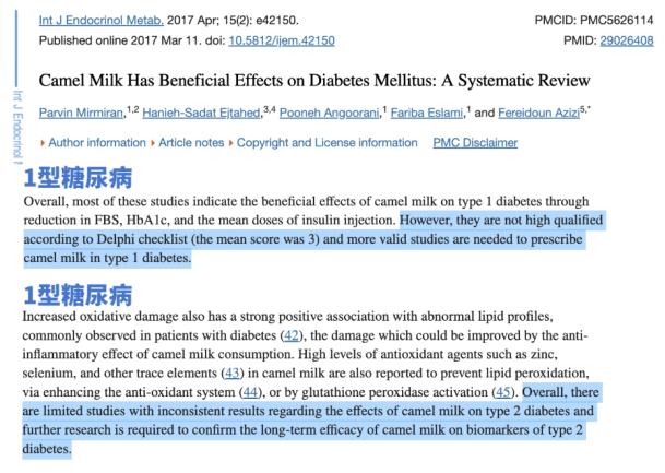 不少人买骆驼奶,是奔着降血糖的作用去的,这也是骆驼奶价值宣传中声浪较大的一个。有商家宣传,一升驼奶相含有当于52个单位的胰岛素,可以辅助降血糖,促进葡萄糖代谢。到底是真有效果还是夸大其词?不吹不黑,根据目前的研究,骆驼奶可能有辅助降低血糖的作用,但是质量不高,还需要样本量更大、实验设计更科学的证据支持。在2017年的一篇囊括了11项临床试验的综述里,里面的实验要么样本量小,要么实验设计不完善。无论是对1型还是2型,骆驼奶降血糖的证据质量都不高,不同的实验甚至还出现了相互矛盾的结论。