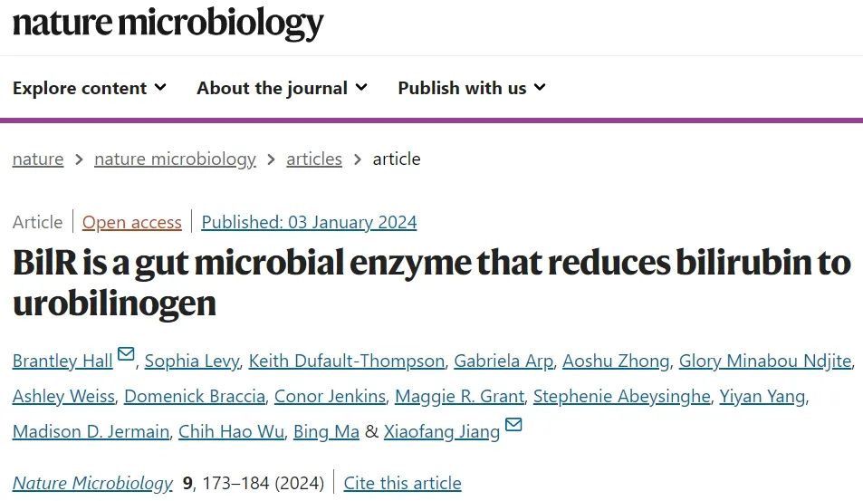 2024年1月3日,美国国立卫生研究院江晓芳及马里兰大学Brantley Hall 共同在《Nature Microbiology》发表题为“BilR is a gut microbial enzyme that reduces bilirubin to urobilinogen”的研究论文,该研究发现BilR是一种肠道微生物来源的胆红素还原酶,可将胆红素还原为尿胆原(urobilinogen)。尿胆原会自发降解为尿胆素(urobilin)的分子,这就是我们所熟悉的黄色的由来。