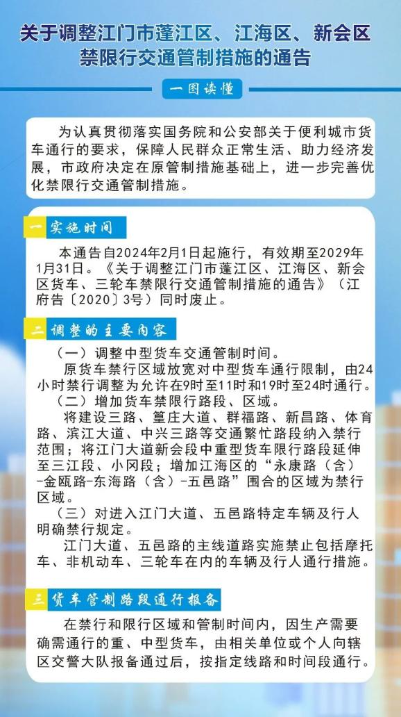 为适应城市发展的需要,有效改善我市交通秩序,规范车辆禁限行区域管控工作,切实保障人民群众出行安全顺畅,根据《中华人民共和国道路交通安全法》第三十九条、《广东省道路交通安全条例》第二十六条的规定,决定自2024年2月1日起,进一步调整蓬江区、江海区、新会区禁行、限行交通管制措施,具体通告如下: