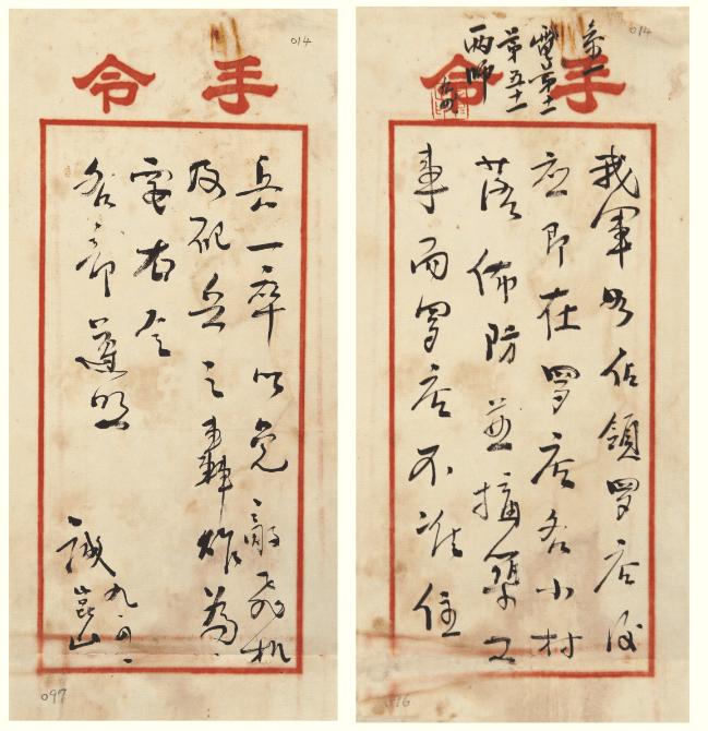 这份手令是1937年八一三淞沪会战爆发后,时任第三战区前敌总指挥兼第十五集团军总司令的陈诚于9月4日罗店争夺战中给部队所发。全文如下:“我军如占领罗店后,应即在罗店各小村落布防,并构筑工事。而罗店不准住一兵一卒,以免敌飞机及炮兵之轰炸为要。右令,各部遵照。诚 昆山 九月四日。”手令背后,附着了八一三淞沪抗战中中国军队一场惨烈的对日争夺战,那就是被称为“血肉磨坊”的罗店争夺战。