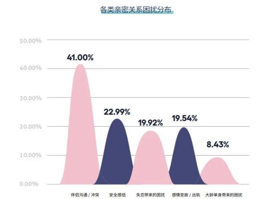 其中伴侣沟通/冲突带来的困扰突出,占比高达41%,安全感排在其后,占比22.99%。