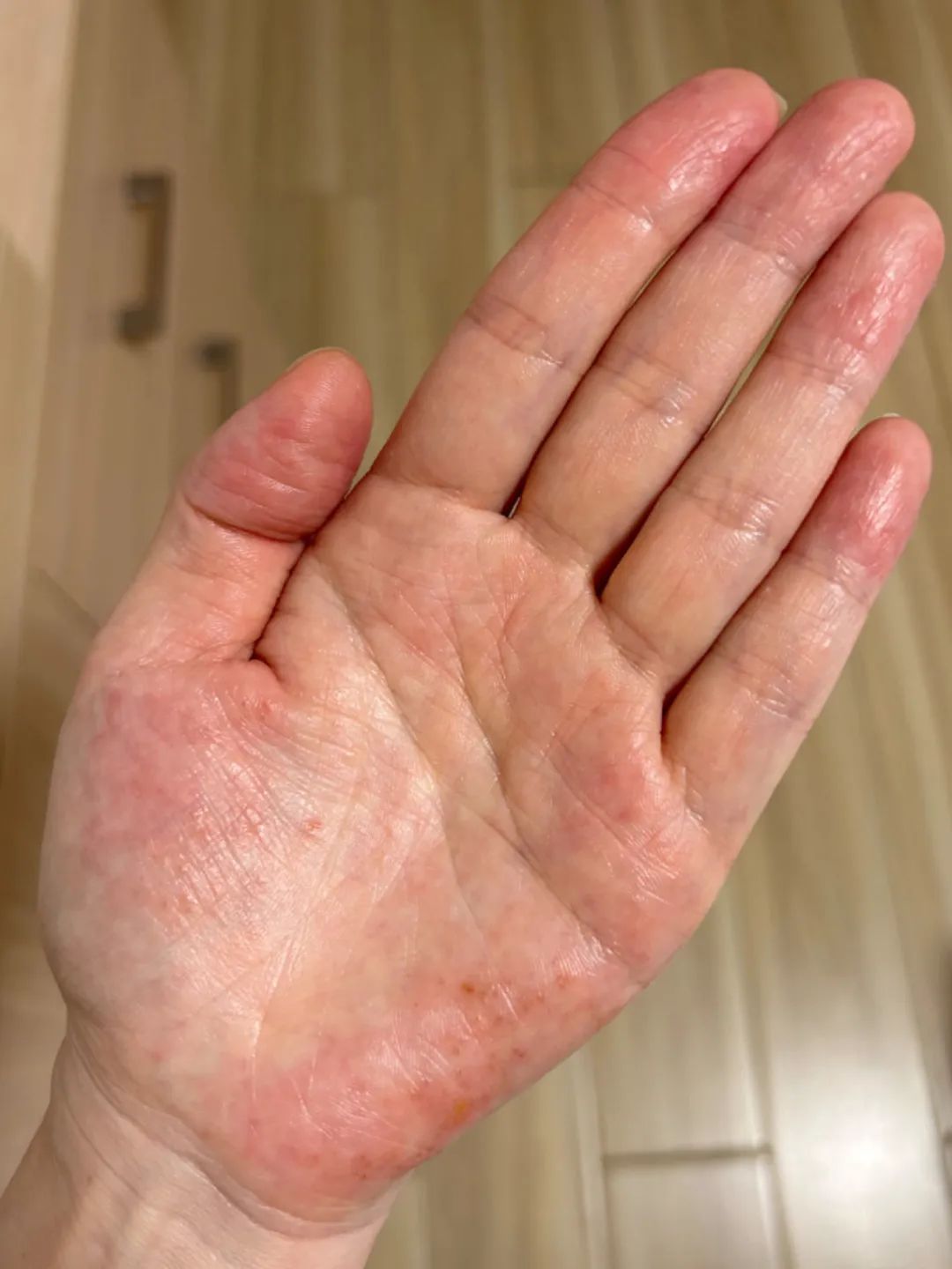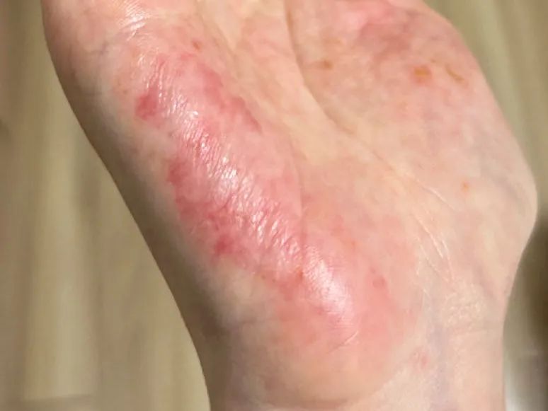 用药的第三天,手掌上的红点和小水疱肉眼可见地少了一些,脱皮的进度也停止了。