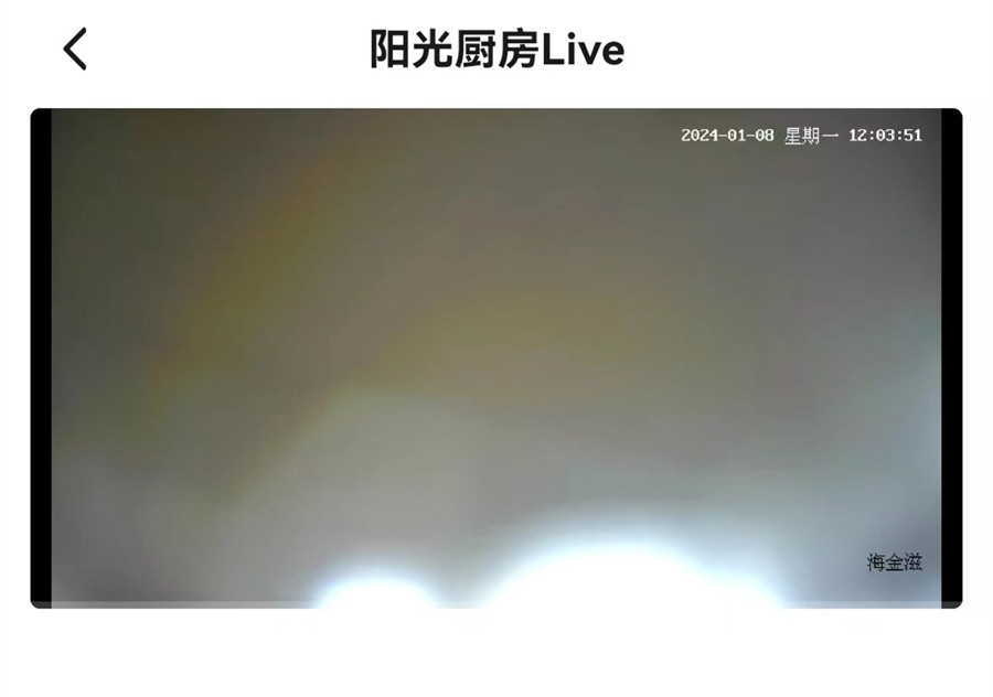 第四类则属于“直播了个寂寞”。小阿婆本帮菜(延安西路店)的直播画面大部分被外卖取餐口上方的品牌宣传板遮挡,下方的取餐口只露出右上角。麻小俏麻辣香锅(徐汇店)的直播画面是倾斜的,外卖取餐口的右下角及周边区域看不见。海金滋(长寿路店)的监控镜头对着无效空间,整个画面蒙上了一层厚重的白雾,只能看到最下方的白色灯光。