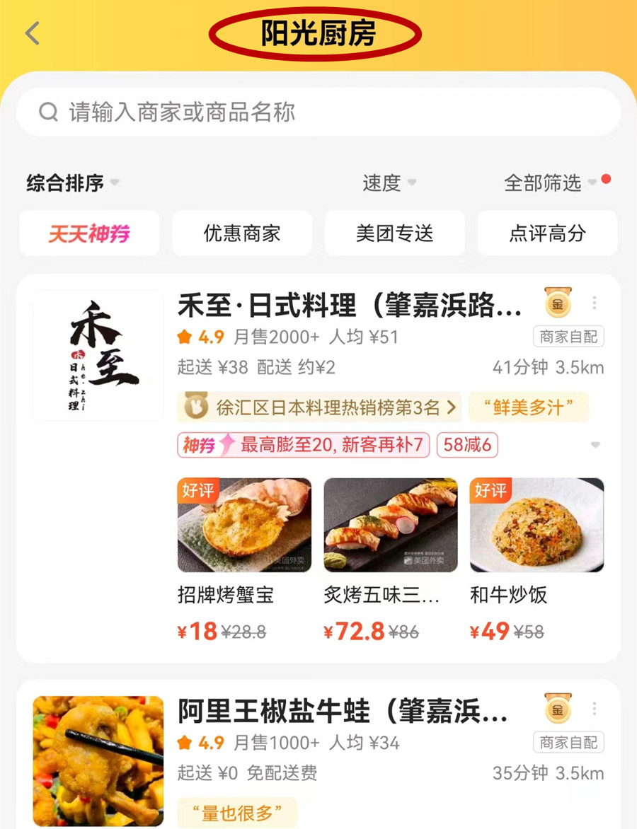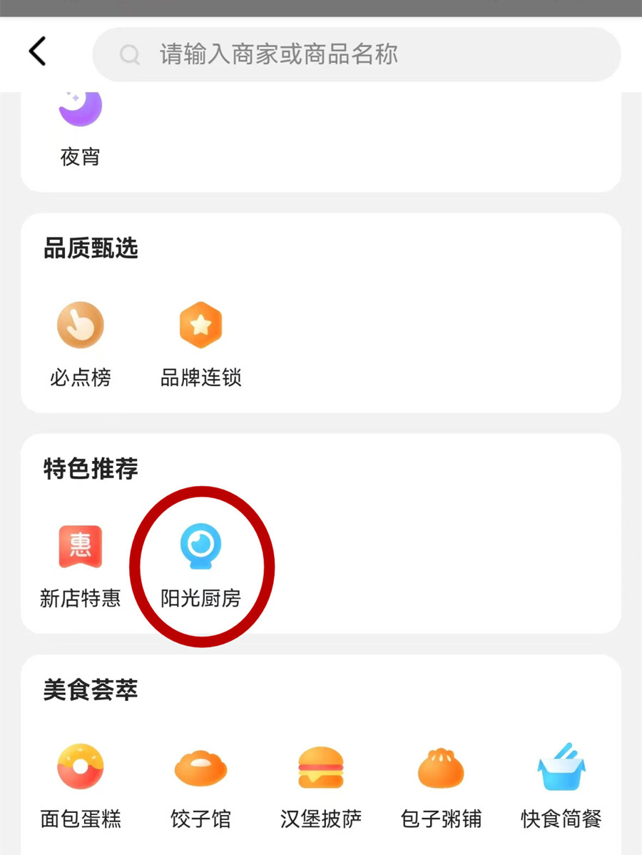要在美团外卖上找到“阳光厨房”也相当费劲。这个入口“藏”在美团外卖页面顶部的综合分类栏的第二屏里,需要向左滑动页面找到“全部”标识,点进去,下滑到页面中部的特色推荐栏,点击“阳光厨房”标识,才能根据定位展示附近的“阳光厨房”。前后至少需要四个步骤。
