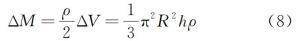 从式(7)可以看出,只要求出赤道环的质量 ΔM,就可求出二分点进动的周期。可赤道环的质量 ΔM 如何求呢?这一点让笔者感到相当棘手。因地球的凸起物在赤道附近更明显,因此作为一个近似,我们暂且认为赤道环的质量可以看做是南纬 30°到北纬 30°之间的凸起物的质量(这也是本文中唯一可能产生较大误差的计算)。赤道半径比极半径大 h=2.1×104m,从南纬 30°到北纬 30°所对应的地球的弧长,因此,赤道环的体积为